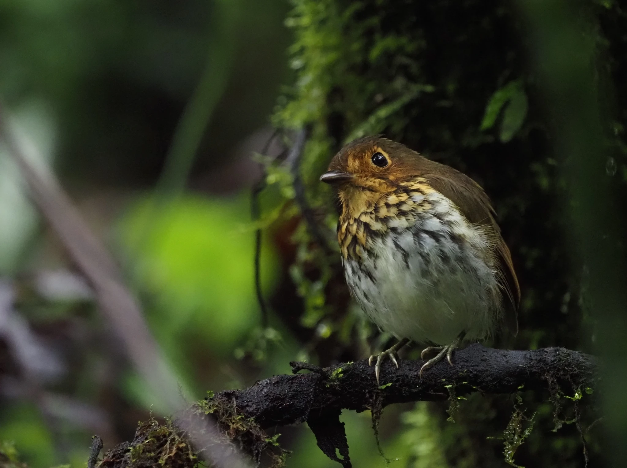 Mööda rada natuke edasi minnes tegutseb okstel täitsa palju linde ilma igasuguse narritamiseta ja on rahulik ja mõnus. Selja tagant saabub seltskond, kes läheb kohtumisele järgmise pooltaltsa antpitta Shakiraga (Grallaricula flavirostris). Kõik rivistatakse sobivasse kaugusesse puutüvest, millele on puistatud ussikesi. Lind seisab puude all samblasel oksal, keerutab pead ja hööritab puusi. Polegi ussikesi vaja. Selgub, et siin tegutseb paar. Kui üks neist pildistamiseks ettenähtud oksale maandub, saan peaaegu pragada, kui julgen pildistada teist lindu tema oma valitud ümbruses, selmet teha sama pilti nagu kõik ülejäänud. Poiss ju ei tea, et ma sisustan nii oma töö- kui ka puhkeaja iseseisvalt. Kalle võtab olukorra tabavalt kokku, et oleme enda teadmata sattunud loomaaeda. Mis teha, puudulik kodutöö. Talitajatega pole tõesti mõtet pahandada. Siin on ikkagi tööstusettevõte.
