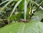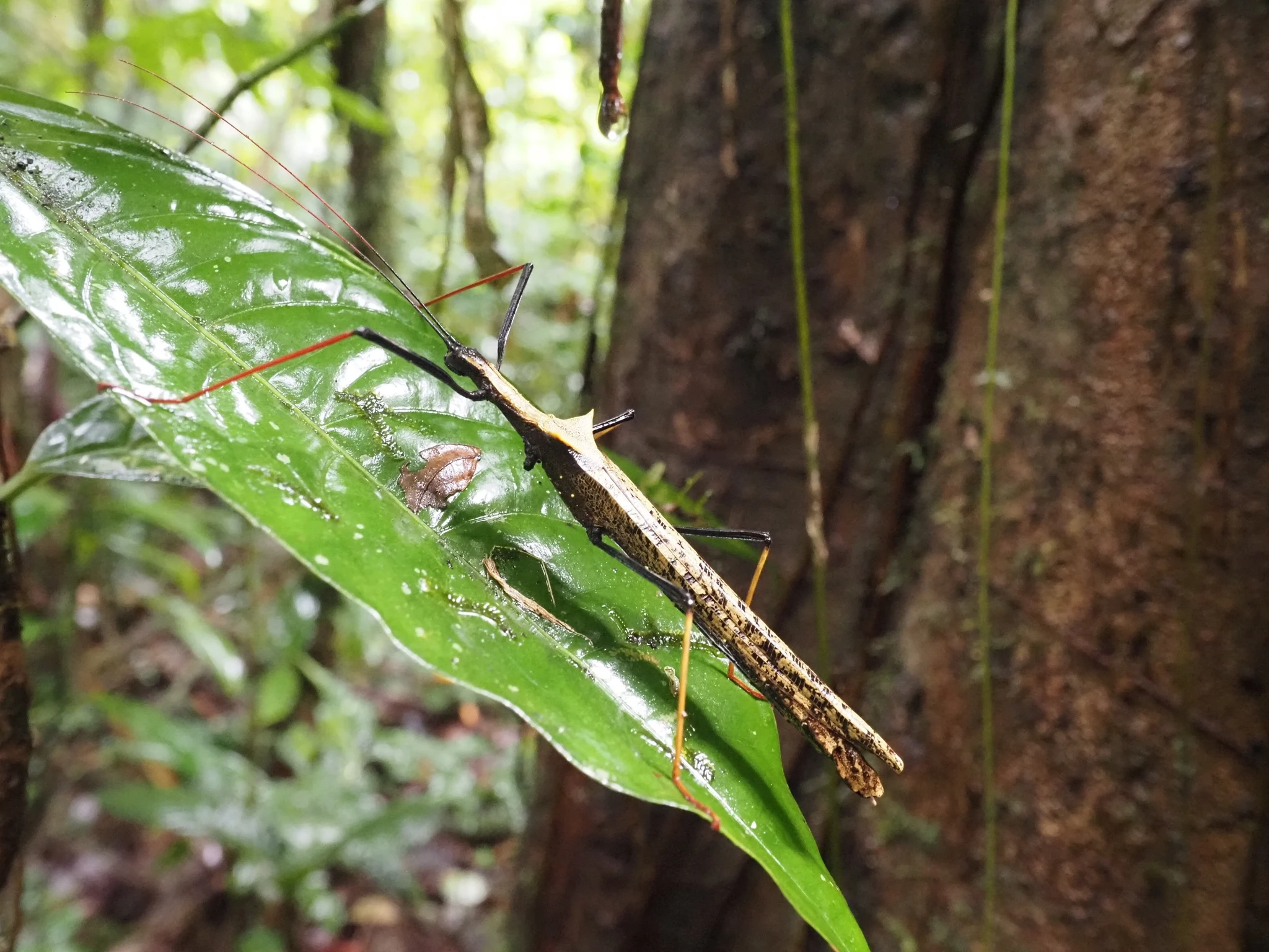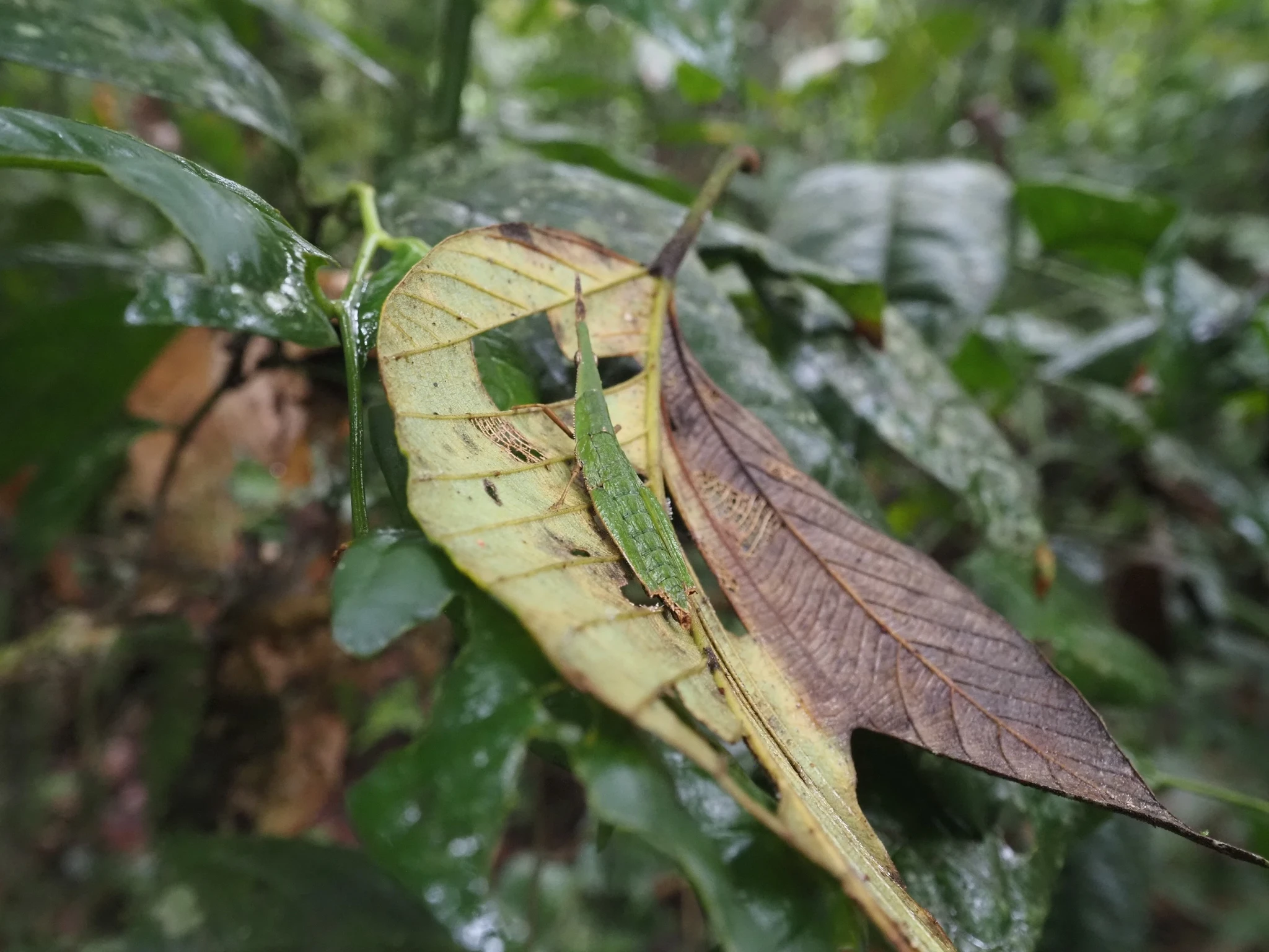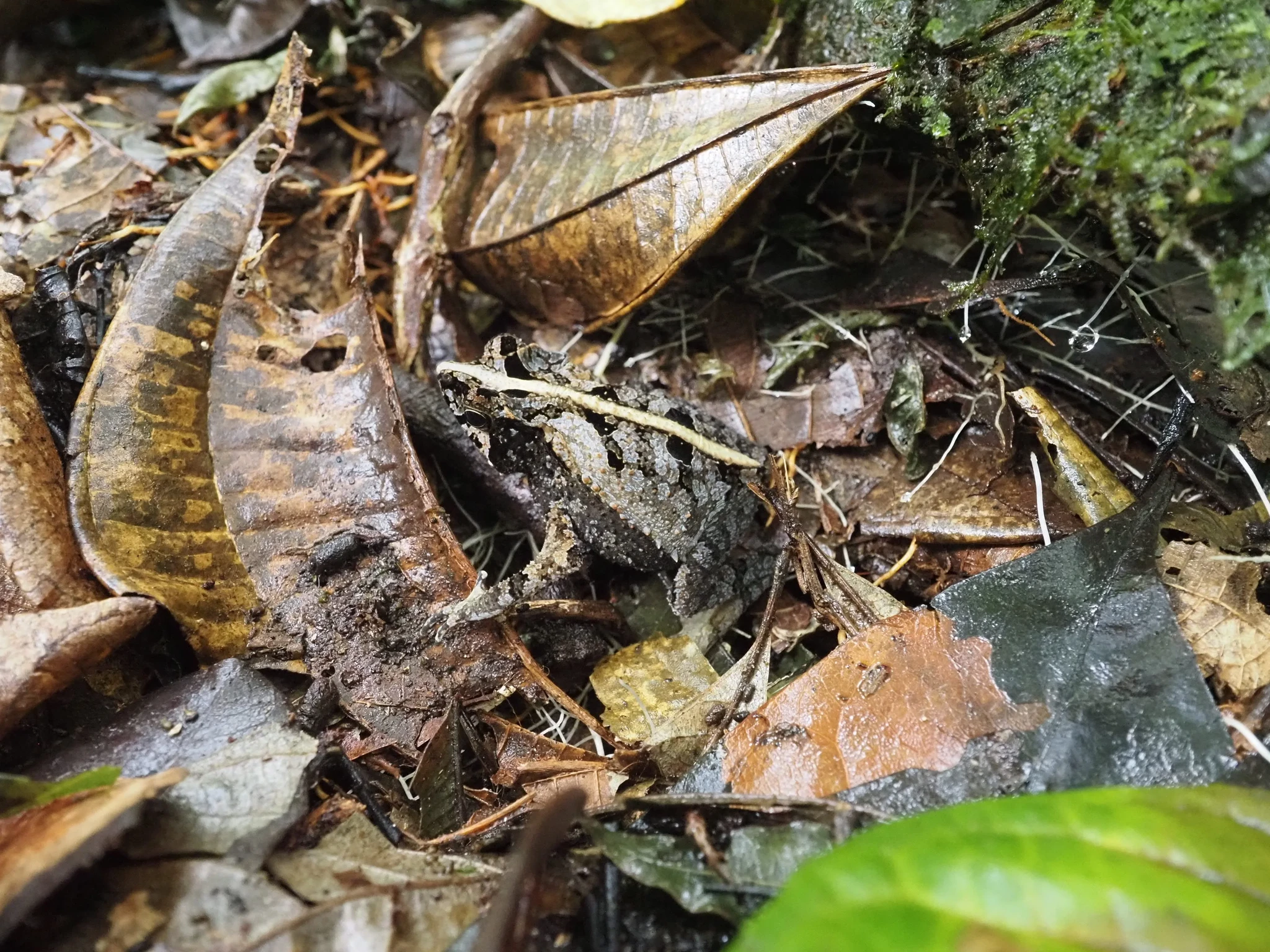 Ramiro sätib maas natuke aega lehti ja küsib, kas ma näen. Pingutan tähelepanelikult vaadata. Näen märgi lehti. Peab olema konn, aga kedagi pole. Kuniks Ramiro talle näpu peaegu peale paneb. Tõesti on konn. Heledam asi polnudki oksaraag, vaid triip konna seljal.