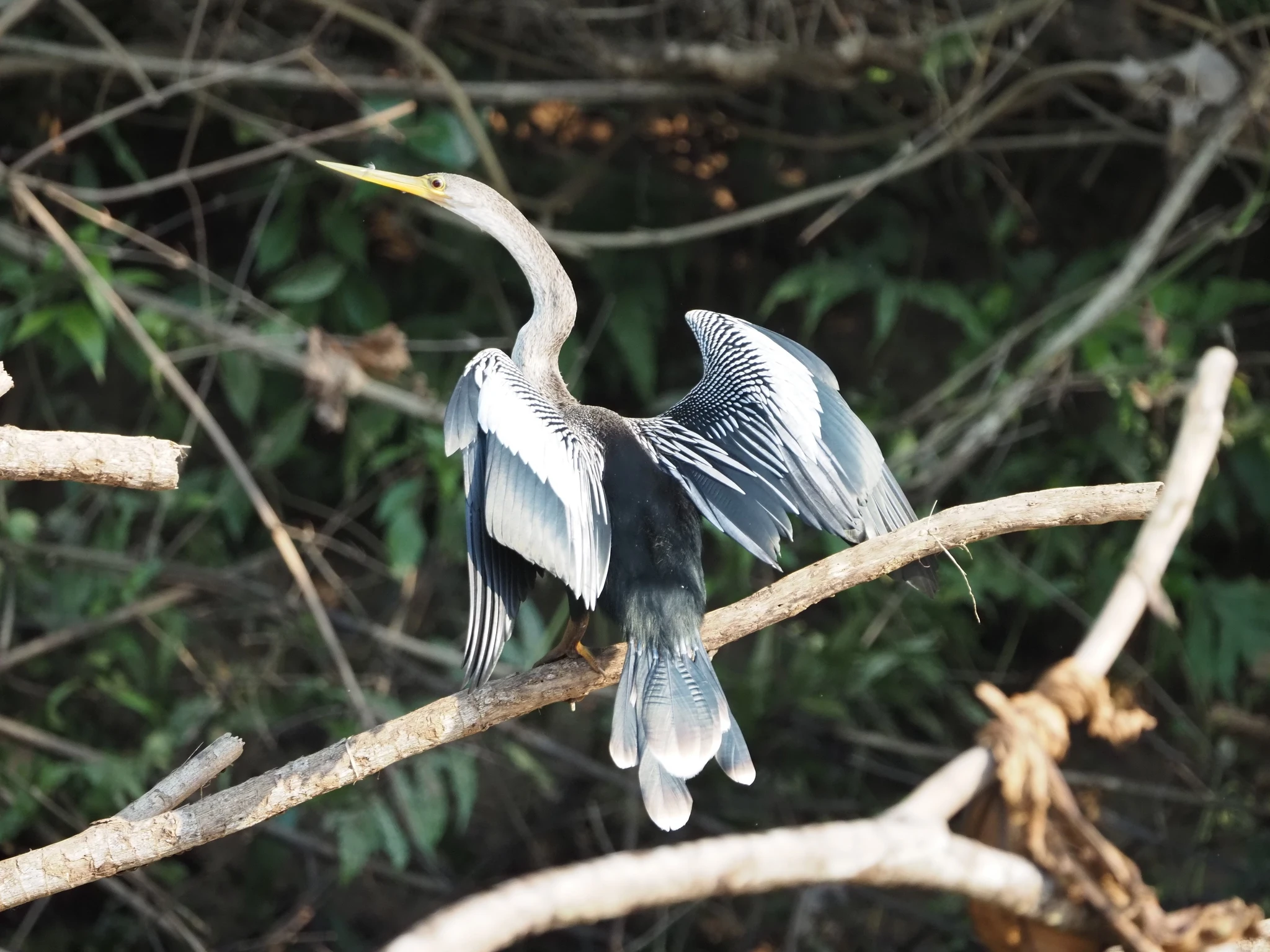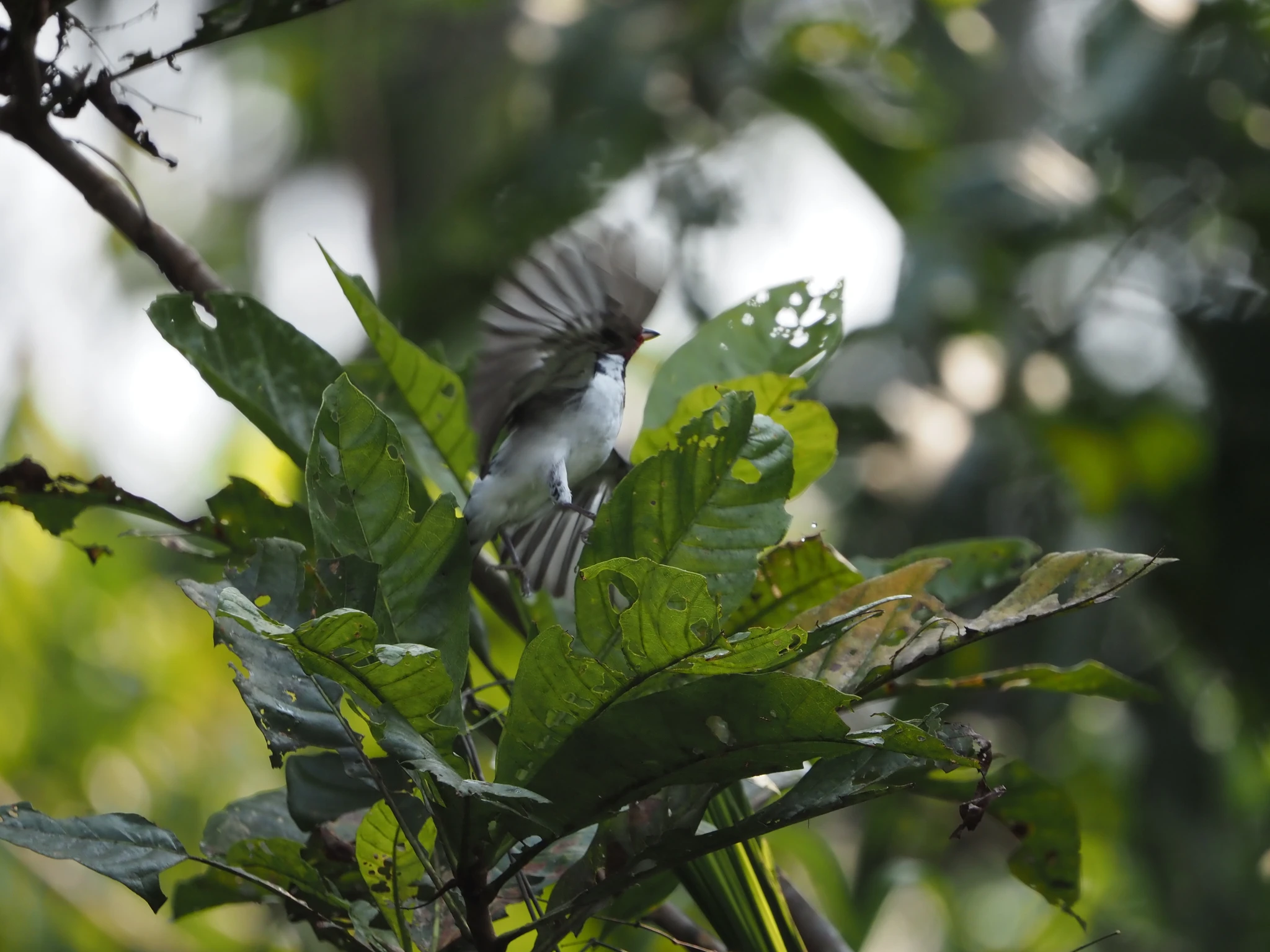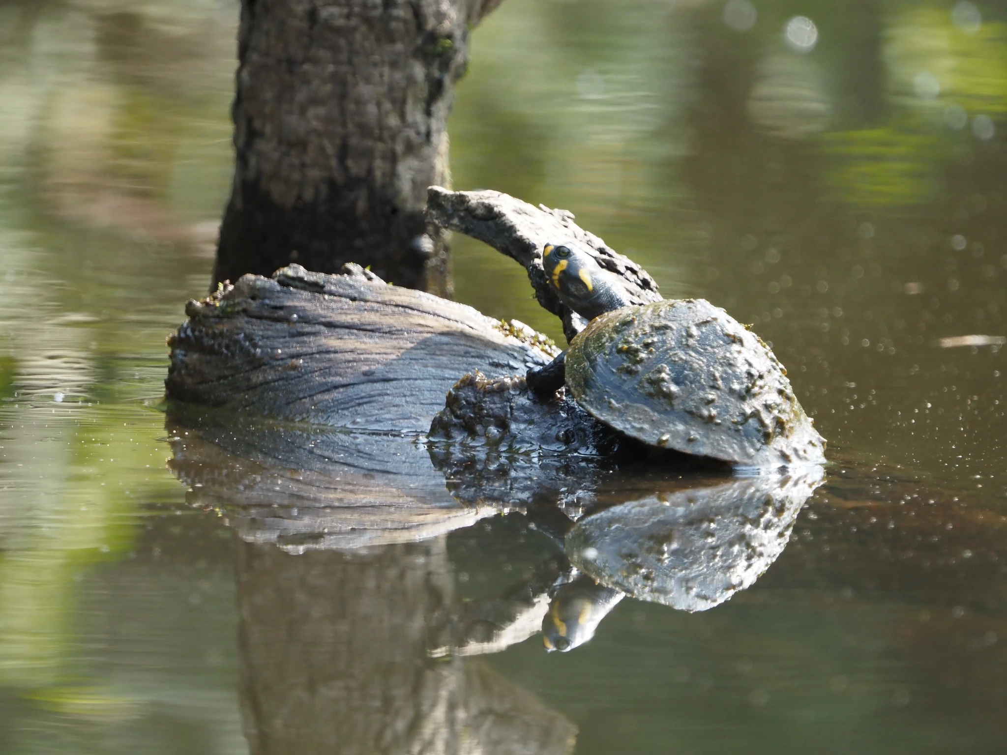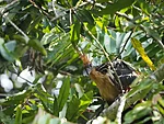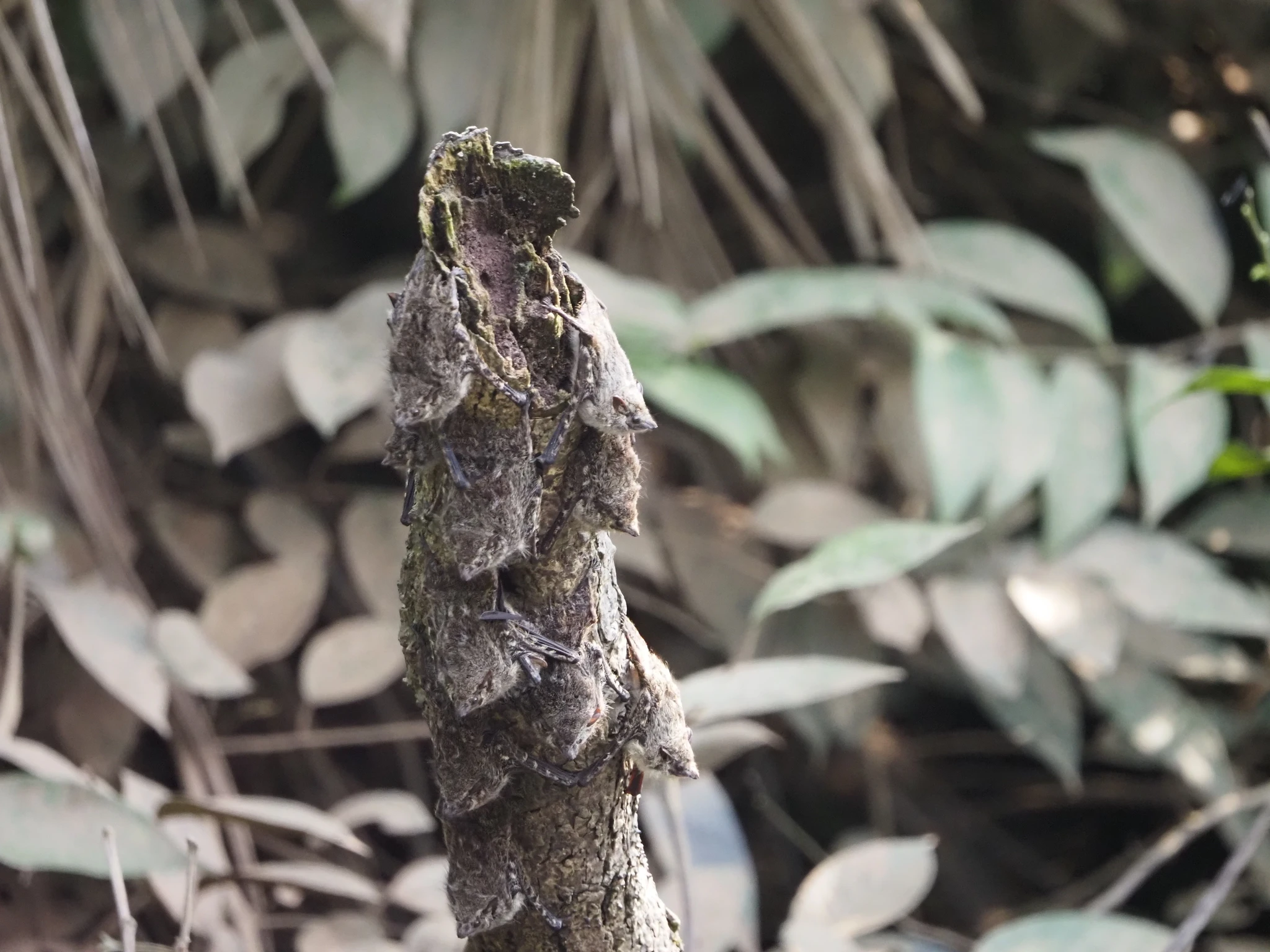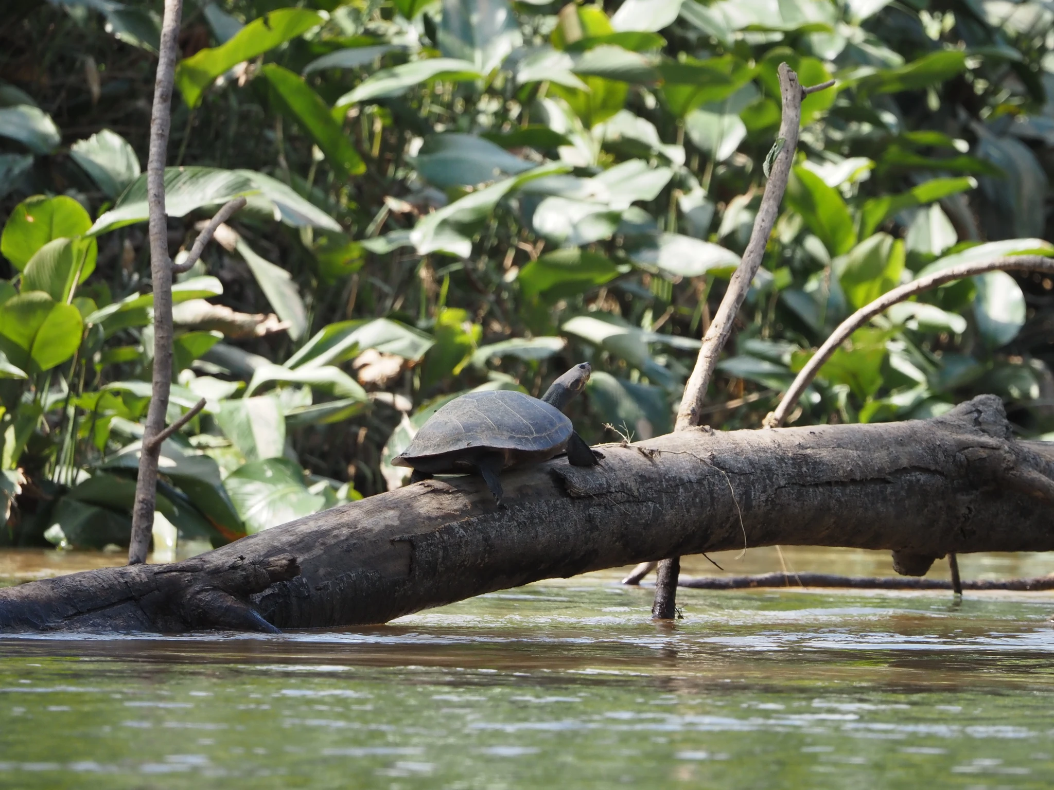Vee kohal sähvivad kogud polegi pääsukesed, vaid taas nahkhiired. Kogunevad kõik veest välja turritavale puutüükale rippu ja lendavad siis korraga laiali. Veidi maad edasi peesitab puutüvel kollaste tähnidega kilpkonn, sama liik, kelle noorloomi üleeile vette lasime, aga see isend siin on umbes aasta vana. Laguuni teises otsas hüpleb põõsal lehtede vahel efektselt punase peaga Paroaria gularis. Anakondast ei mingit märki.