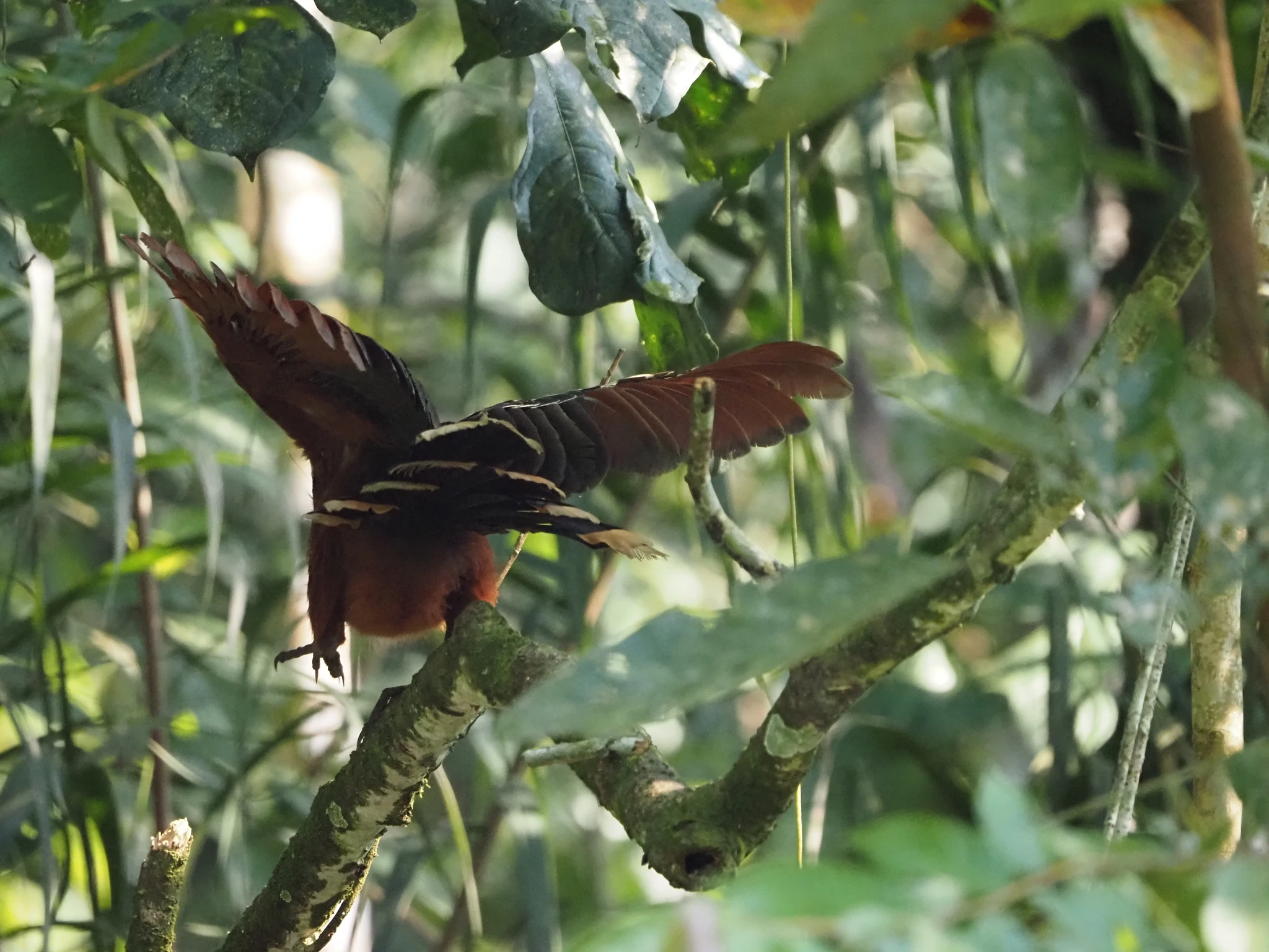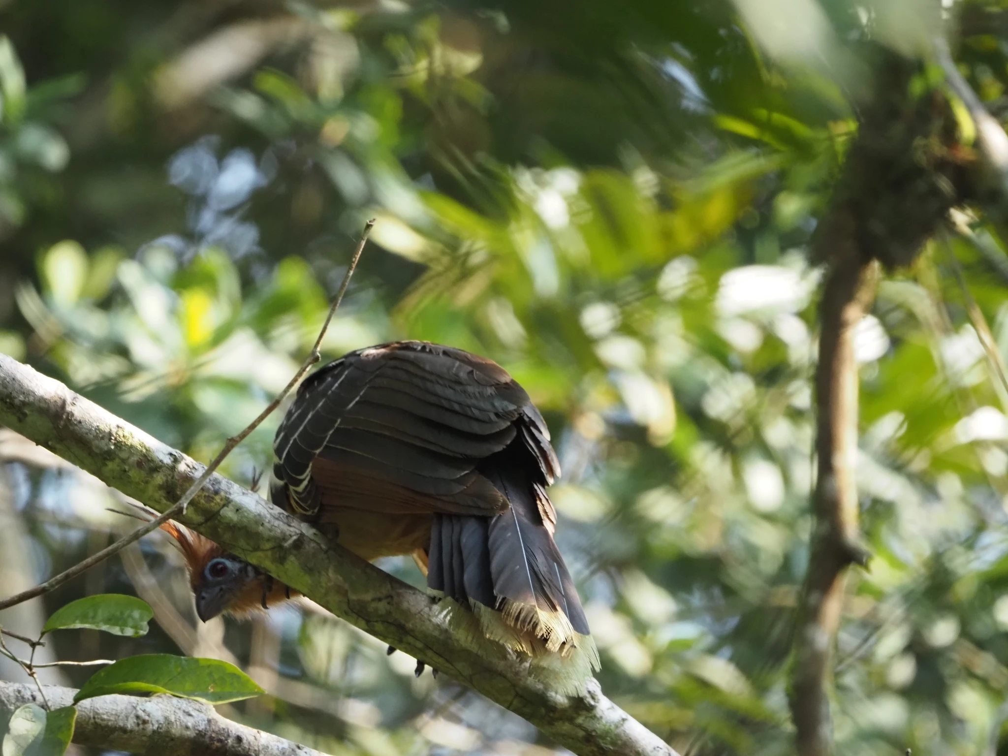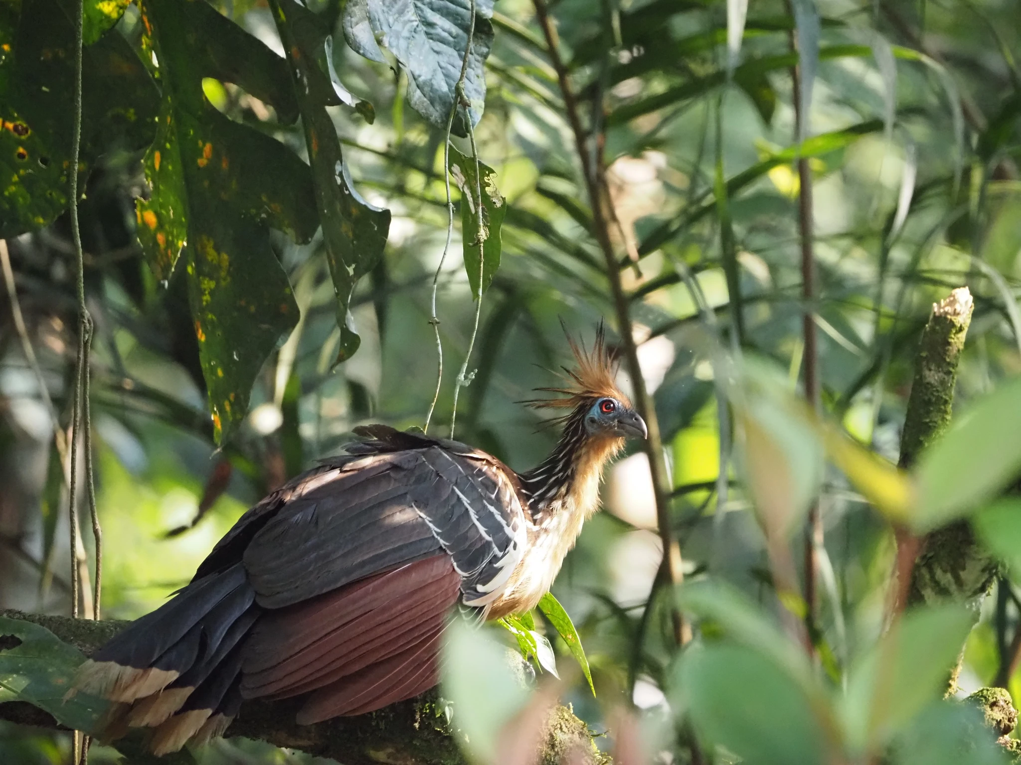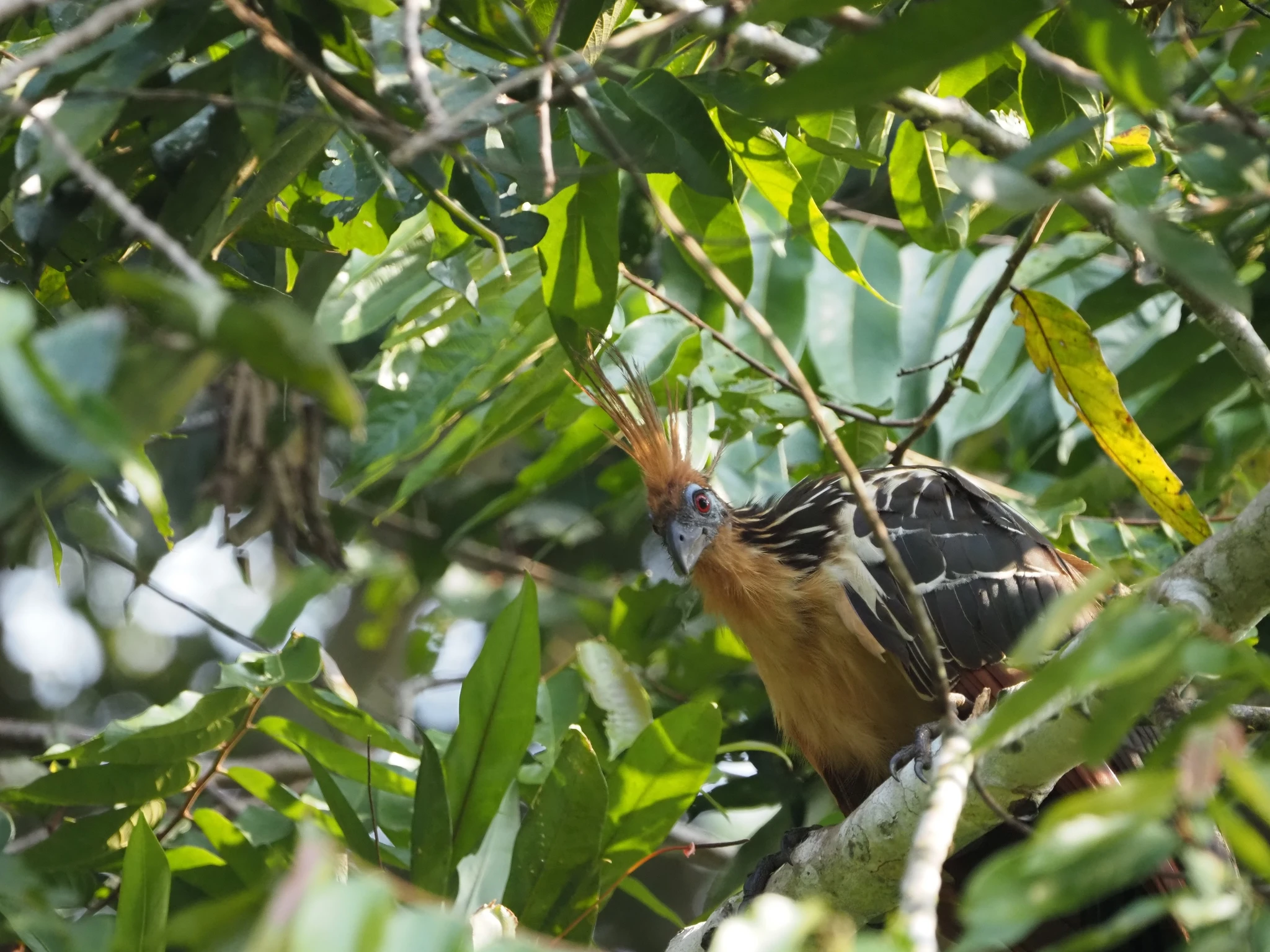 Mingil arusaamatul põhjusel pole kasutada rohkem kui üks kanuu. See ilmselt seletab ka, miks pole toimunud telkimisega kanuuväljasõitu, mis ometi programmis seisab. Igatahes, mahutame end kolmekesi kummivanni, Ramiro istub mõlaga tagumise serva peal. Kalle on keskel ja saab ka ühe mõla. Ma tšillin ninas niisama, aga see-eest pole mul üldse jalaruumi. Aerutame liikumatu veega järvele, mis on nagu peegel. Vasakult kaldalt kostab tuttavat röhitsemist ja kogukad turris soenguga hoatsiinid rabistavad puuokstel. Seekord on nad tunduvalt paremini näha. Koos oma siniste nägude ja punnis punaste silmadega. Vahivad meid sama uudishimulikult kui meie neid. Ramiro pajatab, et aastaid tagasi pesitses laguunil ainult üks paar, nüüd vist 12. Igatahes rohkem. Siin pole siis turism lindudele halvasti mõjunud.