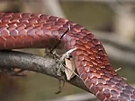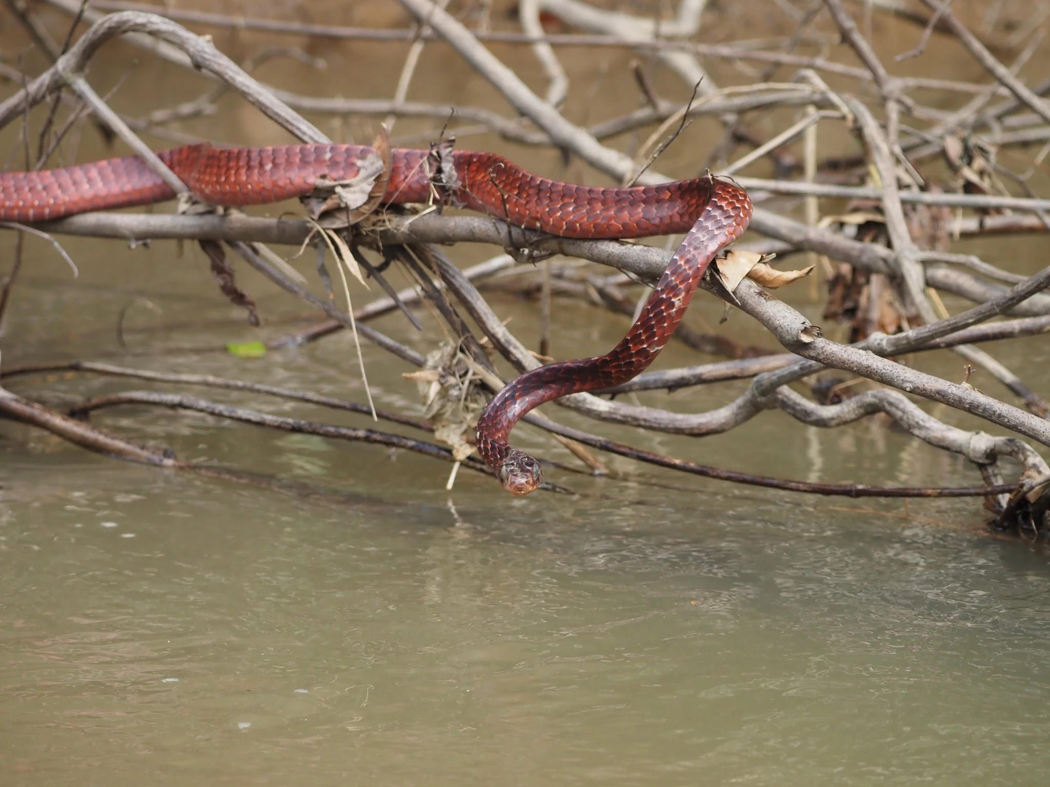 Paadimees peab mõõdukal kiirusel loovima vette kukkunud puude vahel ja aeg-ajalt mootori igaks juhuks veest välja tõstma. Jõest turritaval kuivanud võral lösutab roosakas madu. Meie teda näeme, aga tema meid mitte, sest ta vahetab parasjagu kesta ja on ajutiselt pime. Ei tundu hea mõte olla korraga pooleldi riides ja pime. Inglise keeles rusty whipsnake, ladina keeles Chironius scurrula.