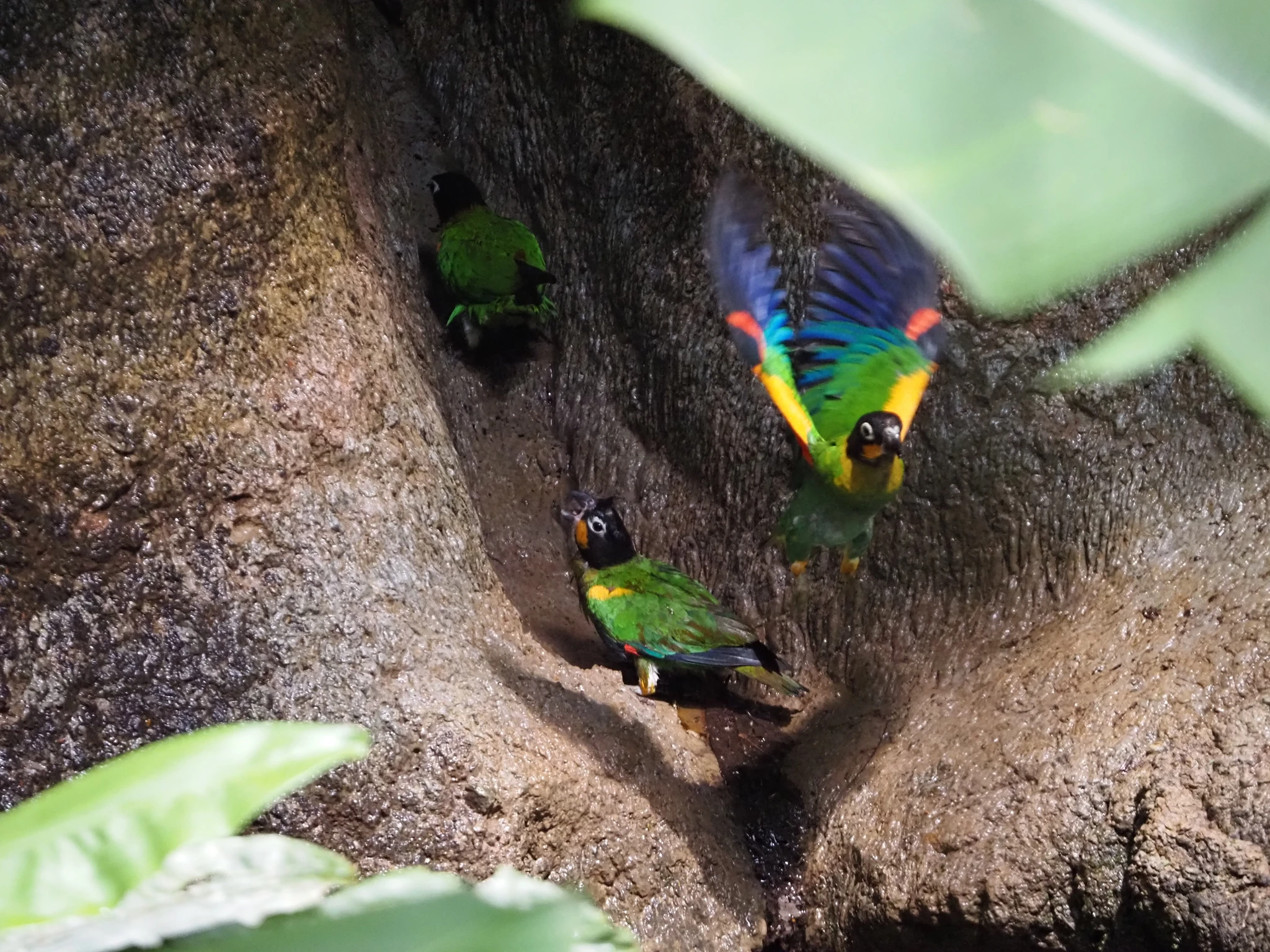 Metsa sees on papagoide joogikoht. Nad käivad kaljust immitsevat mineraalirikast vett joomas. Peab olema vagusi, sest papagoid uurivad enne maapinnale laskumist hoolikalt ümbrust. Saabuvad kuldpõsk-selvapapagoid, rohelise kere, musta pea ja oranžide põskedega. Kui tiivad lahti löövad, vilksatab ka punast, kollast ja sinist. Võtavad tükk aega okstel hoogu ja krõhvivad ennast. Lõpuks on terve punt all koopasuu juures, kust voolav vesi on pinnasesse renni uuristanud. Jalgadega end kahele poole renni serva vastu toetades ronivad osad linnud üle nende, kes koopasuule lähemal joovad. Tulevad ka mõned tumehallid tuvid. Kui papagoid lahkuvad, saab võileiba ja mandariini. Sääsed on vahepeal käeseljad täpiliseks söönud.