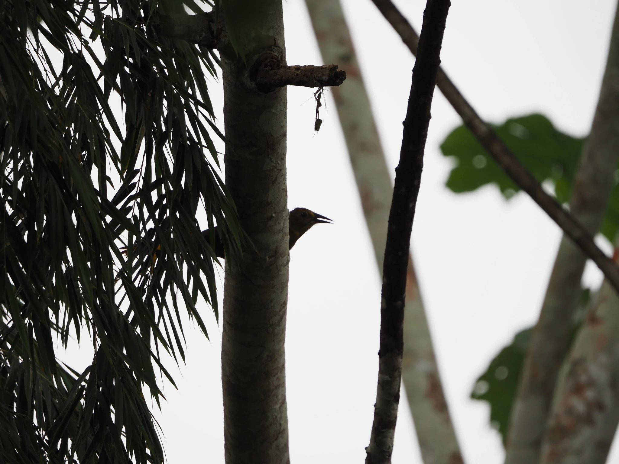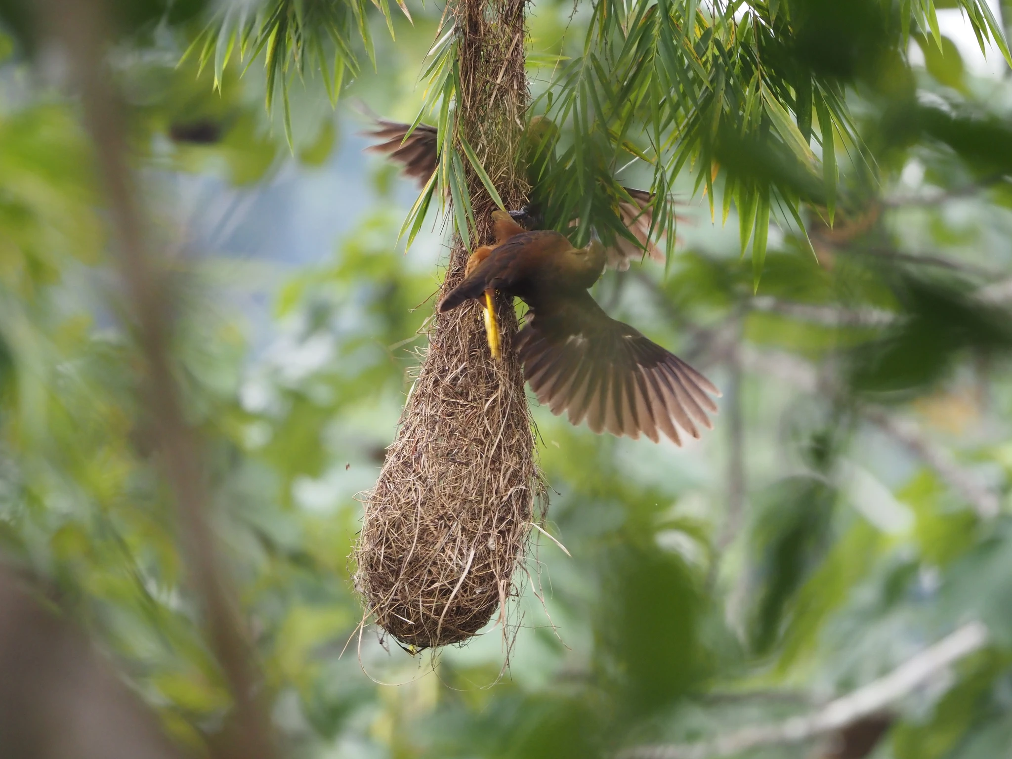 Linnud, kes olid keskpäevases palavuses kisamise katkestanud, ärkavad päevasest roidumusest, hakkavad edasi-tagasi lendama ja kädistama. Meie lemmik on veetilga kukkumist meenutava häälega eris-suurturpial. Meisterdab kõrtest nuiakujulisi pesi, mis mitmekaupa kõrgel puuokstel ripuvad. Turpialile meeldib pesitseda grupiviisiliselt. Saan pildile hüttide vahel patseeriva päikesekure.