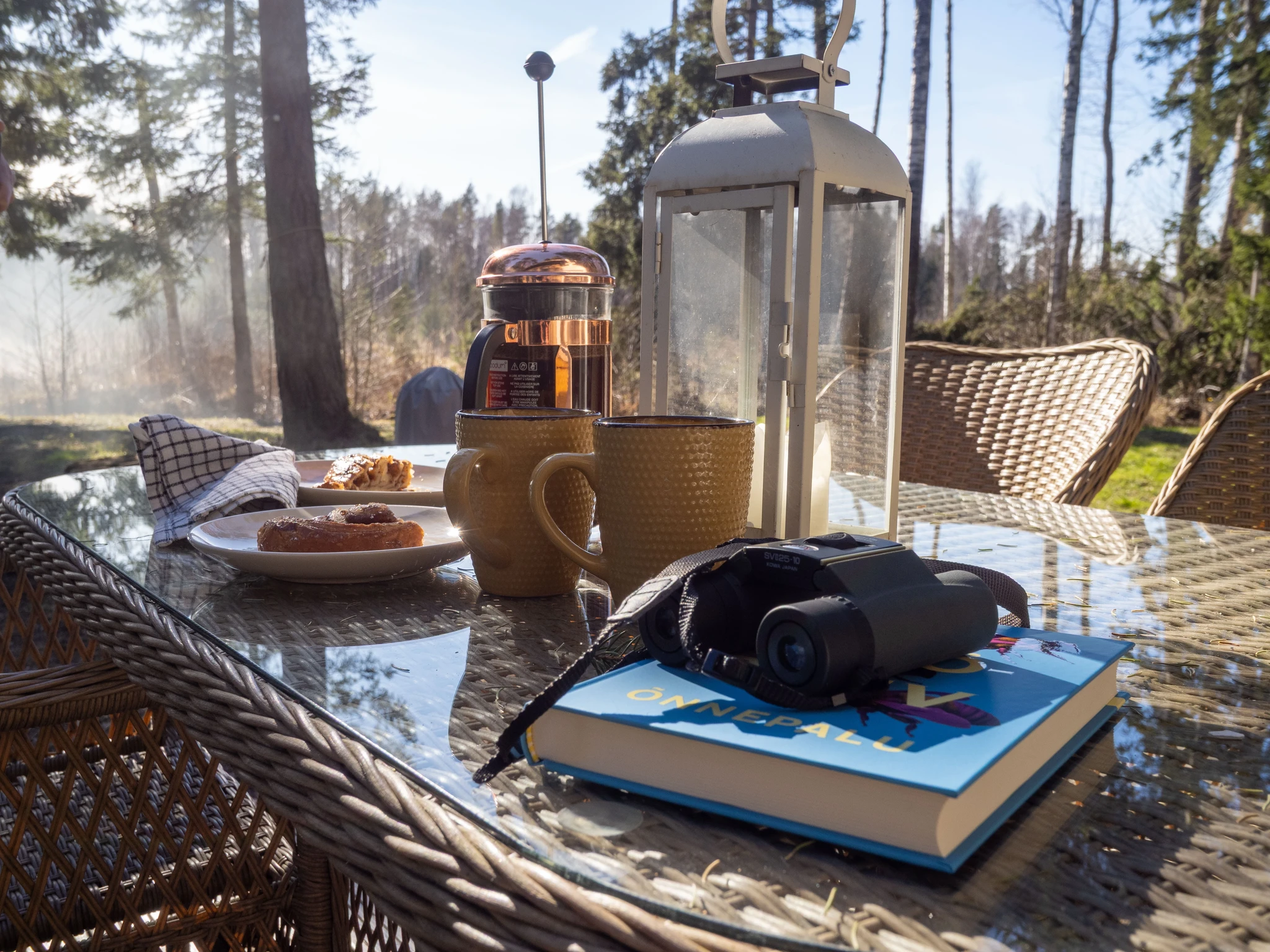 Maja juures sirutuvad päiksekiired viltu puude vahele. Kuulda on kaht lääne-pöialpoissi. Üht on lausa näha. Uustulnukad meie maal. Õhtul on saun vaatega kuuskedele. Kusagil katuse lähedal siristab punarind.